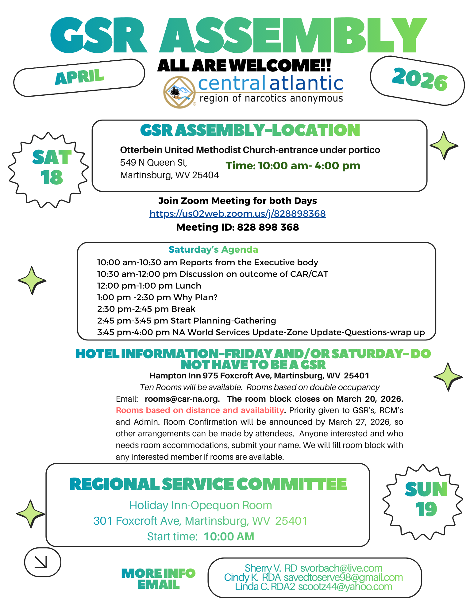 GSR Assembly- All Are Welcome!!! Martinsburg, WV Download FlierDownload Flier + Add to Google Calendar + iCal / Outlook export The event is finished. Date Apr 18 2026 Expired! Time 10:00 am - 4:00 pm Location Otterbein Methodist Church Otterbein United Methodist Church, 549 W. Queen St., Back of Church, 2nd Parking lot in the basement, Martinsburg, Berkeley County, WV